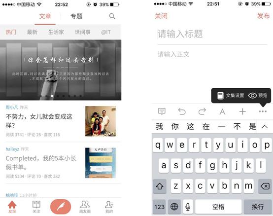 從交互上(shàng)來(lái)說,簡書(shū)APP采用了iOS最常見的Tab标簽式的交互框架,各入口較為(wèi)清晰。在點擊文章之後進入沉浸式的閱讀體(tǐ)驗之中,提供了無打擾的閱讀體(tǐ)驗。整體(tǐ)的交互也很(hěn)流暢,符合iOS的交互規範。