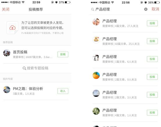 體(tǐ)驗中發現搜索專題進行(xíng)投稿時(shí),會(huì)搜出來(lái)很(hěn)多(duō),而且由于很(hěn)多(duō)專題是可(kě)以同名,就會(huì)讓用戶無法比較難找到自己想投的專題。所以建議在進行(xíng)“投稿推薦”時(shí),将原本的“搜索專題投稿”直接改成“更多(duō)專題投稿”,點擊後彈出一些(xiē)投稿建議,同時(shí)上(shàng)面可(kě)以點擊搜索框另外搜索,如下圖所示。而對于建議的專題,有(yǒu)個(gè)較為(wèi)簡便的方式就是直接将用戶關注的專題,按文章标題相關性排序,因為(wèi)用戶想要投往的專題,很(hěn)大(dà)可(kě)能會(huì)是他自己也關注了的專題。