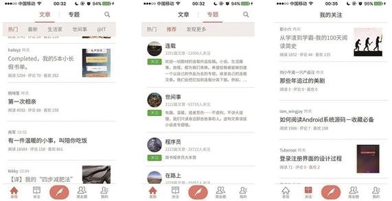 “關注”欄則是用戶關注的作(zuò)、專題或文集中收錄的文章,在文章上(shàng)向左滑動,還(hái)可(kě)以查看導緻這篇文章出現的關注源,以便用戶可(kě)以随時(shí)調整自己的關注源,比如某專題後來(lái)總是發一些(xiē)自己不再感興趣的文章,則可(kě)以将其取消。随着用戶在簡書(shū)時(shí)間(jiān)越長,對于關注的作(zuò)者、專題調整,相信“關注”這一欄的文章也會(huì)越來(lái)越對用戶的口味。