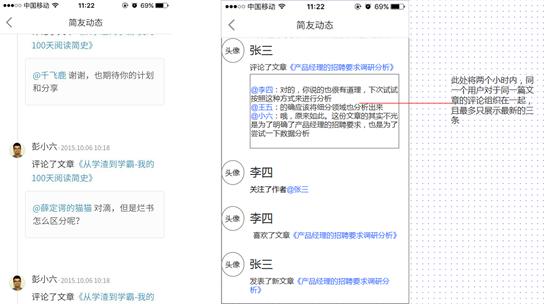 簡友(yǒu)動态的想法其實很(hěn)好,但(dàn)是感覺目前的組織方式不太好。目前采用時(shí)間(jiān)流的方式,如下左圖,簡友(yǒu)的任何操作(zuò)都會(huì)以一個(gè)一條動态的方式顯示,且間(jiān)距相隔也較大(dà),如下圖左側所示。導緻當某位簡友(yǒu)對同一篇文章頻繁評論時(shí),列表會(huì)非常之長,易讓用戶産生(shēng)厭煩。