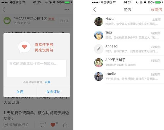 另外點擊“喜歡”,和(hé)打賞(最新的iOS版可(kě)能由于蘋果原因暫時(shí)去掉了該功能)也算(suàn)是交流的方式,尤其點擊“喜歡”後還(hái)會(huì)跳(tiào)出提醒,讓讀者順便評論一下,算(suàn)是在引導用戶進行(xíng)交流。當然,這裏還(hái)有(yǒu)個(gè)細節是,會(huì)在彈出框中明(míng)顯處提醒用戶可(kě)以關閉這個(gè)功能,可(kě)以避免讓用戶産生(shēng)膩煩不爽的感覺。