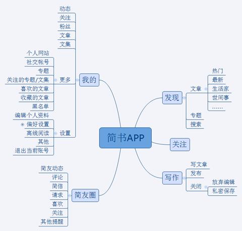 根據前面戰略層的分析,其實我們已經很(hěn)容易想到簡書(shū)的主要功能有(yǒu)哪些(xiē)。目前簡書(shū)的主要功能有(yǒu),寫作(zuò)與投稿、閱讀、交流、分享、專題管理(lǐ)。