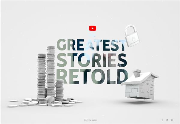 Greatest Stories Retold 這個(gè)網頁中采用了相同的概念,字母背後有(yǒu)視(shì)頻在播放,這種形式留給用戶更多(duō)想象力。視(shì)頻中的信息其實傳遞出來(lái)的并不多(duō),更多(duō)的是色彩和(hé)明(míng)顯的運動感,它們真正的功能是誘使用戶點擊并查看更多(duō)的網頁內(nèi)容。