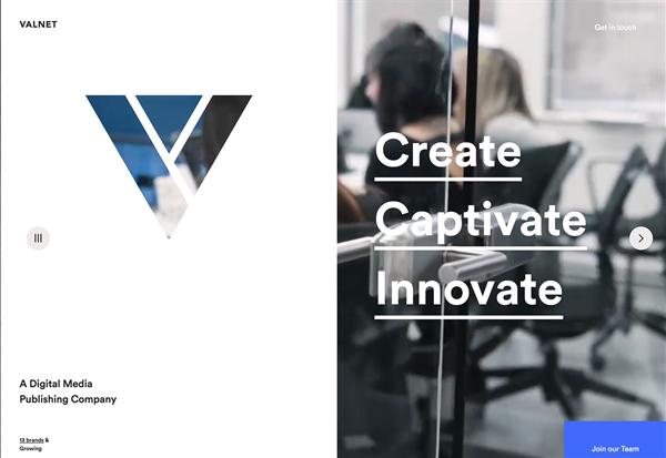 Valnet在它的首頁左側,有(yǒu)一個(gè)巨大(dà)加粗的字母V,在背景中嵌入動态的視(shì)頻,字母所形成的新的框架,讓視(shì)頻的體(tǐ)驗更加獨特有(yǒu)趣。