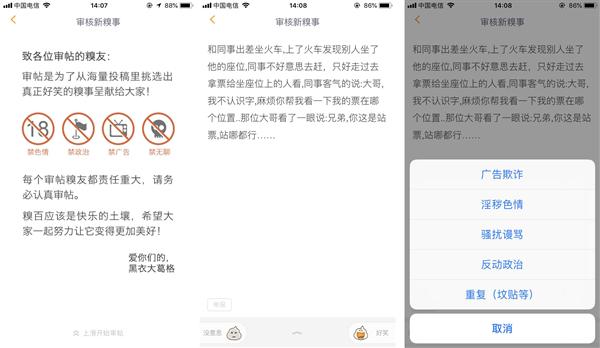 在這款産品中,一直有(yǒu)一個(gè)很(hěn)不錯的功能,就是用戶審核功能,所有(yǒu)用戶産生(shēng)的內(nèi)容都會(huì)由用戶自己去選擇是否可(kě)以出現在産品裏,有(yǒu)一段時(shí)間(jiān)自己覺得(de)審稿比看已經出現在産品裏的段子還(hái)要着迷。