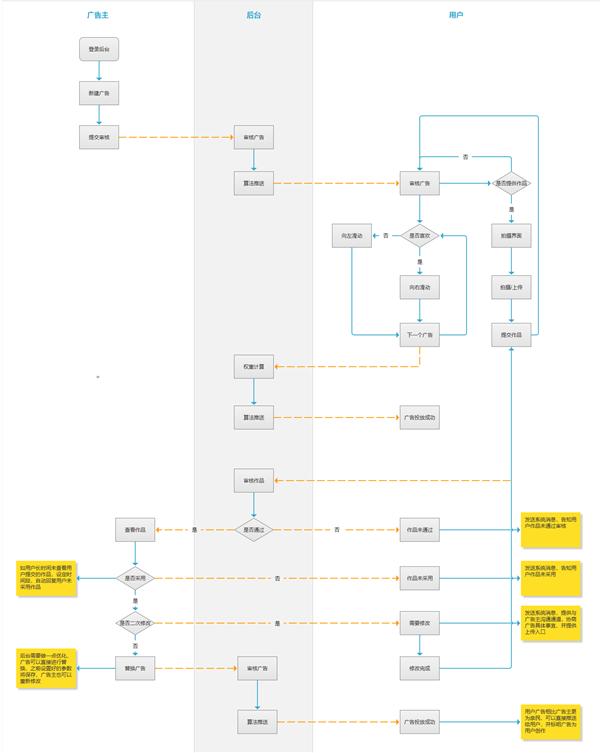 以上(shàng)是一個(gè)簡單的頁面流程圖,從用戶審核廣告到廣告成功投放的過程,具體(tǐ)肯定是需要再細化的,這隻不過是一個(gè)想法。