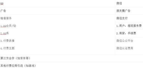 從兩者的盈利方式對比可(kě)以發現,QQ增值服務主要是向用戶收費,而微信主要是向企業收費。尤其從微信支付可(kě)以看出,微信提供更多(duō)的第三方服務接口,除了滴滴、美團、唯品會(huì)等,還(hái)提供政府相關的服務,例如社保、公積金等。