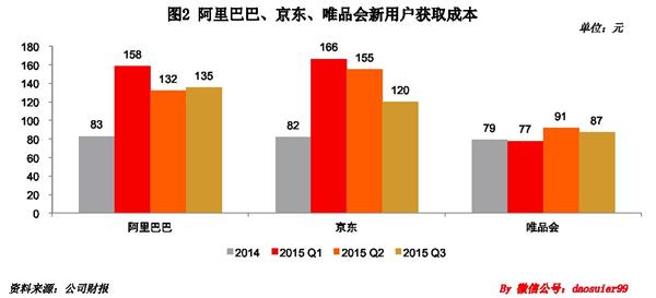 第二個(gè)我們來(lái)看看幾家(jiā)電(diàn)商巨頭在2015年Q3獲取一個(gè)新用戶需要花(huā)多(duō)少(shǎo)錢(qián)。我們可(kě)以看到幾家(jiā)公司的新用戶獲取成本在2015年都有(yǒu)非常顯著的提升,稍微低(dī)一些(xiē)的唯品會(huì)也要将近100元。