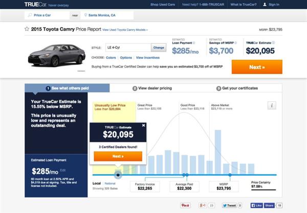 相比傳統的模式,通(tōng)過TrueCar的網站(zhàn)、移動端等渠道(dào),消費者可(kě)以享受到更為(wèi)便捷的購車(chē)體(tǐ)驗。在TrueCar提供的渠道(dào)上(shàng),消費者選擇了品牌和(hé)車(chē)型之後,輸入所在地的郵編,在多(duō)數(shù)情況下就可(kě)以得(de)到TrueCar提供的價格曲線,顯示最近一段時(shí)間(jiān)內(nèi)該車(chē)型的交易價格和(hé)成交數(shù)量,其中還(hái)包括工廠發票(piào)價格(Factory Invoice)、平均價格、廠商指導價等。