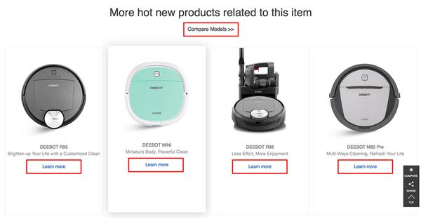 高(gāo)質量的精修産品圖片、産品視(shì)頻、抓人(rén)的文案、閱讀舒适的排版……這些(xiē)都提升頁面的轉化率的制(zhì)勝法寶。那(nà)麽,如果展示的是同一品類的産品,比如掃地機器(qì)人(rén),我們應該怎樣通(tōng)過設計(jì)去體(tǐ)現不同型号的價格呢?