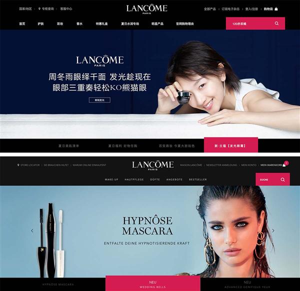 如下圖所示:蘭蔻中國和(hé)蘭蔻德國的網站(zhàn)框架及設計(jì)風格一緻,但(dàn)banner圖中的代言人(rén)和(hé)産品是有(yǒu)差異的,符合蘭蔻品牌本土化的戰略。