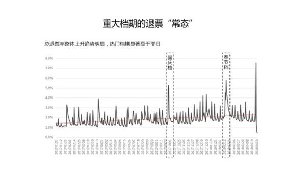 第一點,淘票(piào)票(piào)使用了 2018 年全年的平均退票(piào)率比對《後來(lái)的我們》的單片退票(piào)率。但(dàn)年平均的數(shù)值和(hé)單片的峰值是沒有(yǒu)可(kě)比性的,因為(wèi)票(piào)房(fáng)少(shǎo)則一天三四千萬、多(duō)則 12 個(gè)億,波峰、波谷非常明(míng)顯的。