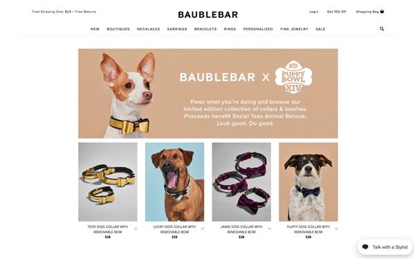 Baublebar 在 Puppy Bowl 的着陸頁上(shàng)就做(zuò)的很(hěn)好,網站(zhàn)主要銷售女性珠寶,設計(jì)師(shī)在網站(zhàn)的導航欄上(shàng)标識出關鍵詞“Baubles”,也讓用戶明(míng)白這個(gè)頁面是針對寵物的。