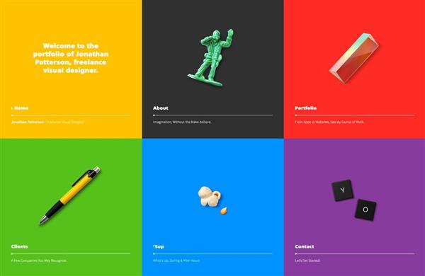 Jonathan Patterson 的着陸頁中,每個(gè)明(míng)亮的色塊都會(huì)在光标懸停的時(shí)候變暗,并且予以說明(míng),引導用戶去點擊獲取更多(duō)信息。