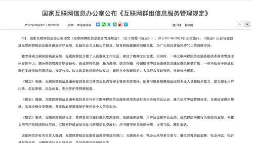 國家(jiā)互聯網信息辦公室今日公布《互聯網群組信息服務管理(lǐ)規定》(簡稱《規定》),并于 2017 年 10 月 8 日正式施行(xíng)。