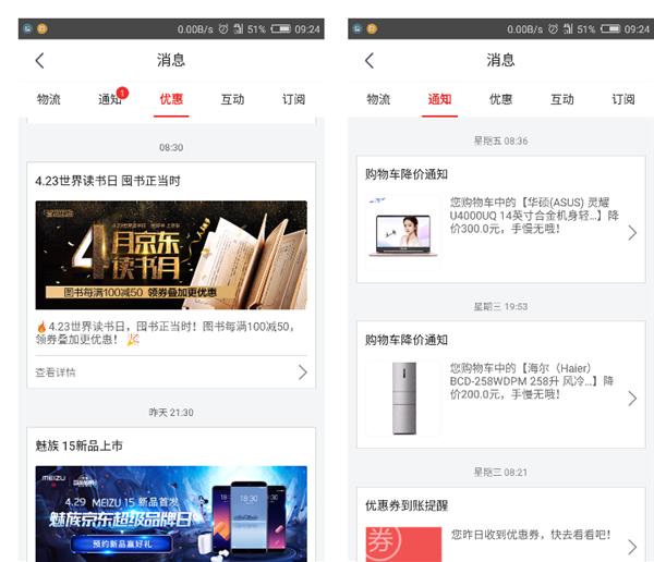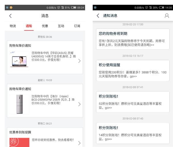 圖5-2 京東&天貓通(tōng)知消息(圖片來(lái)源:京東商城、天貓)