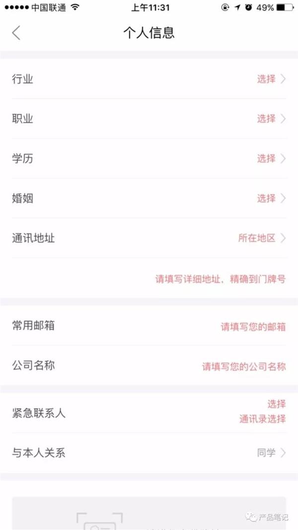 比如有(yǒu)的現金貸産品,主流程的個(gè)人(rén)信息頁,需要填寫N多(duō)信息。常用郵箱、公司名稱一定要主流程中必填嗎?不能作(zuò)為(wèi)個(gè)人(rén)中心或授信中心的高(gāo)級認證存在?主流程中,不是非必要,能砍則砍。