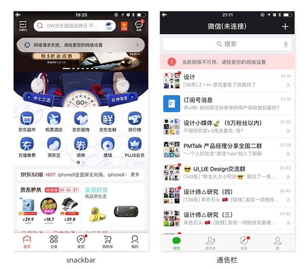snackbar和(hé)通(tōng)告欄的區(qū)别在于snackbar的位置是固定的,隻要你(nǐ)的網絡不暢通(tōng),那(nà)麽它一直會(huì)出現在界面頂部。這是因為(wèi)京東對于網絡的訴求比微信要更強,沒有(yǒu)網絡微信用戶還(hái)可(kě)以翻看聊天記錄,京東用戶沒有(yǒu)網絡還(hái)能幹什麽?沒有(yǒu)辦法浏覽商品,更不用說剁手了,京東比微信更需要用戶去解決網絡故障的問題。