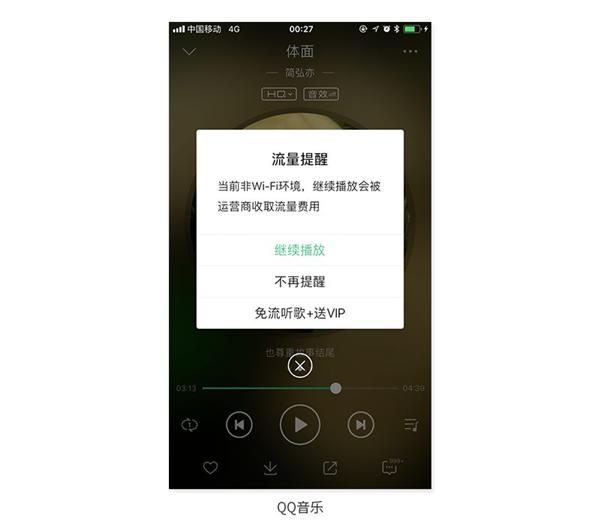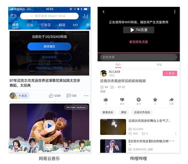 當我用wifi觀看視(shì)頻,突然wifi斷掉,會(huì)自動切換至4G網絡。為(wèi)了避免讓用戶在不知情的情況下耗費大(dà)量的流量,我們應該給用戶一個(gè)網絡變更的提示,用戶确認之後才可(kě)以繼續觀看。提示的方式目前來(lái)說主要界面內(nèi)嵌和(hé)對話(huà)框,哔哩哔哩和(hé)網易雲音(yīn)樂這裏用的都是界面內(nèi)嵌。