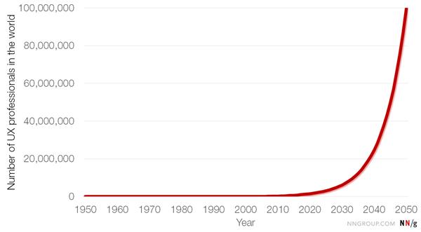 2017至2050年:用戶體(tǐ)驗專業預期會(huì)從現在的 100 萬人(rén)增至 1 億人(rén)。增長系數(shù)為(wèi)100。