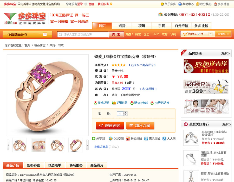 多(duō)多(duō)珠寶商城是國內(nèi)首家(jiā)專注時(shí)尚珠寶購物的網上(shàng)商城。多(duō)多(duō)珠寶經過自身的努力和(hé)發展,目前已經成為(wèi)社會(huì)白領、金領最受歡迎的珠寶購物網站(zhàn)。