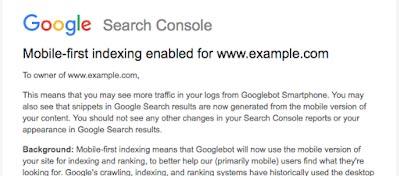 怎樣知道(dào)自己的網站(zhàn)已經轉為(wèi)mobile-first index?Google說會(huì)在Google Search Console中通(tōng)知站(zhàn)長,消息大(dà)緻是這個(gè)樣子:
