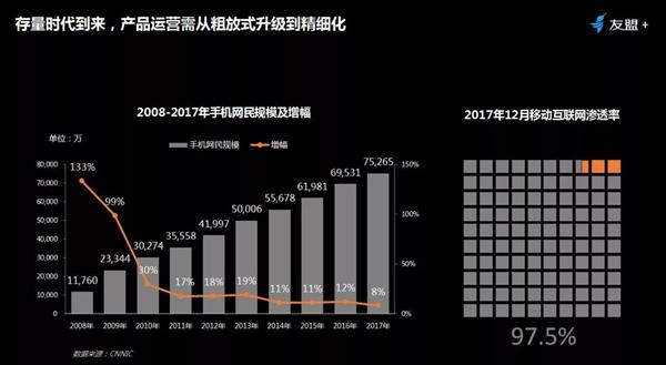 近 10 年來(lái),中國手機網民規模一路攀升,相反地網民增幅一路下跌,已降到10%以下。同時(shí),移動互聯網滲透率已經高(gāo)達97.5%,隻有(yǒu)2.5%沒有(yǒu)被覆蓋。很(hěn)顯然,存量用戶已成為(wèi)App開(kāi)發者争奪的主戰場(chǎng)。