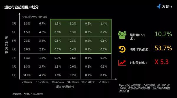 2)運動行(xíng)業超級用戶劃分:10.2%的用戶,貢獻53.7%周時(shí)長