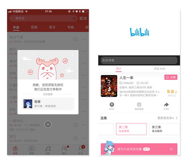在網易雲音(yīn)樂中,置灰代表着當前歌(gē)曲沒有(yǒu)版權,無法播放。這裏篩選的維度是該歌(gē)曲是否有(yǒu)版權。同樣是版權原因,b站(zhàn)中如果該視(shì)頻沒有(yǒu)取得(de)下載權限,采用的就是我下面所說的功能置灰,直接禁用下載icon,用戶無法點擊。這種處理(lǐ)方法有(yǒu)待商榷,我覺得(de)像網易雲一樣提供一個(gè)彈框安撫一下用戶會(huì)更好點。