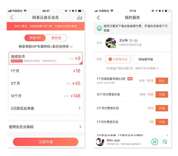 其餘的競品都是用戶點擊下載icon,直接進入開(kāi)通(tōng)會(huì)員/購買單曲的頁面,在頂部以通(tōng)告欄的形式,告知用戶下載該歌(gē)曲必須要開(kāi)通(tōng)音(yīn)樂包或者選擇單曲購買,跳(tiào)過了對話(huà)框。
