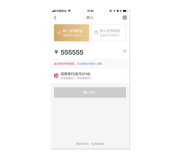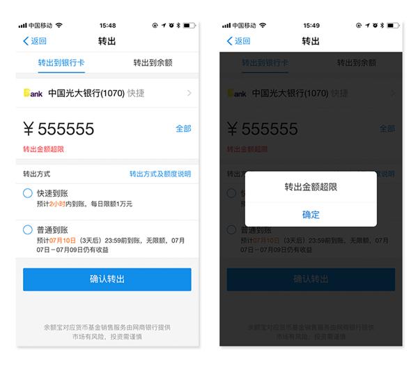 以支付寶的提現場(chǎng)景為(wèi)例,如果一個(gè)用戶打算(suàn)把錢(qián)轉出到自己的銀行(xíng)卡裏。賬戶餘額隻有(yǒu) 5 萬,但(dàn)是他輸入了 55 萬,輸入框立刻校(xiào)驗出錯誤,并且在下方給予文字提示。可(kě)是底部的轉出按鈕依然是可(kě)點擊狀态,用戶點擊之後,彈出一個(gè)對話(huà)框提示用戶“轉出金額超限”(跟底部提示文字一樣)。