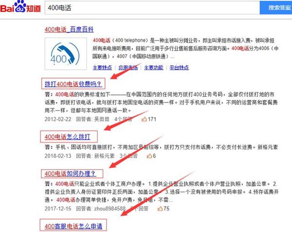 如圖所示,在百度知道(dào)中搜索“400電(diàn)話(huà)”這個(gè)關鍵詞出現了“400電(diàn)話(huà)如何辦理(lǐ)”“400客服電(diàn)話(huà)怎麽申請(qǐng)”這些(xiē)關鍵詞,這些(xiē)都屬于長尾關鍵詞。而且是我們的精準客戶習慣搜索的長尾關鍵詞。