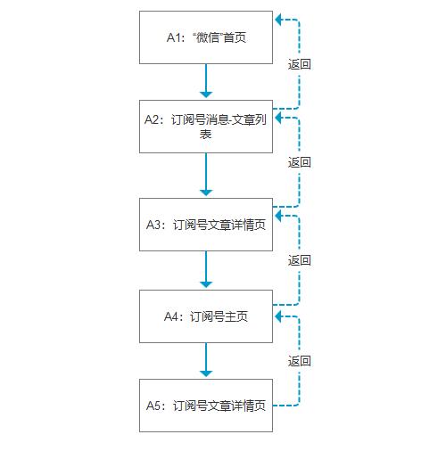 假如微信在上(shàng)面用戶的操作(zuò)中沒有(yǒu)插入“首頁”,那(nà)麽從A1 到A4,再在A4 訂閱号主頁點擊文章,頁面有(yǒu) 5 個(gè)層級。這也就意味着,用戶進入公衆号閱讀文章後,至少(shǎo)要點 4 次“返回”,才能回到首頁聊天。如下圖: