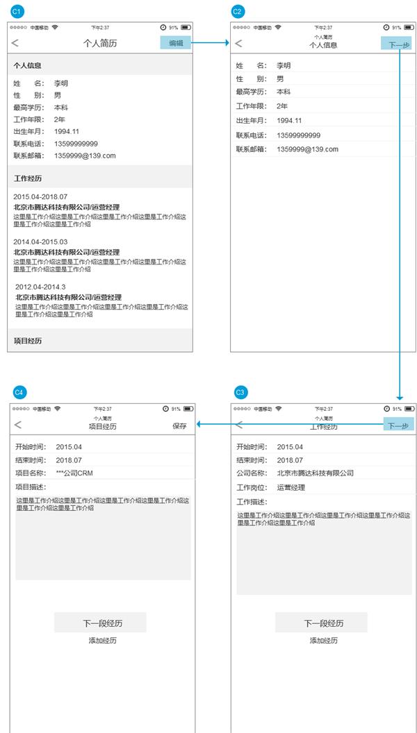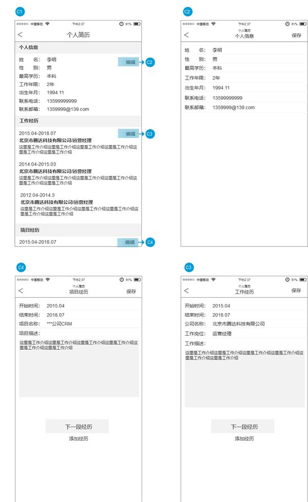 把任務分解後,頁面層級減少(shǎo)為(wèi) 2 層,每個(gè)頁面都可(kě)以快速返回個(gè)人(rén)簡曆頁面。同時(shí),可(kě)以選擇某一個(gè)子任務單獨去完成。(上(shàng)面的草圖隻是為(wèi)了說明(míng)頁面關系)
