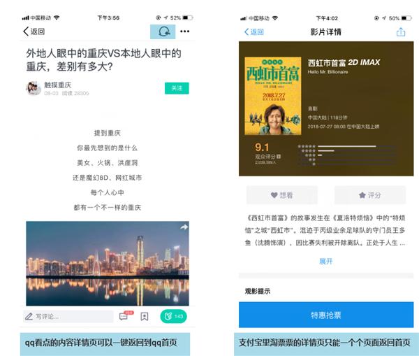 這裏所指的獨立內(nèi)容模塊包含webview(例如微信公衆号、qq看點等)、小(xiǎo)程序、插件式的第三方原生(shēng)APP(支付寶裏的淘票(piào)票(piào))等等。對這個(gè)問題,騰訊的qq和(hé)微信已經完美解決,而支付寶還(hái)不是很(hěn)重視(shì)。
