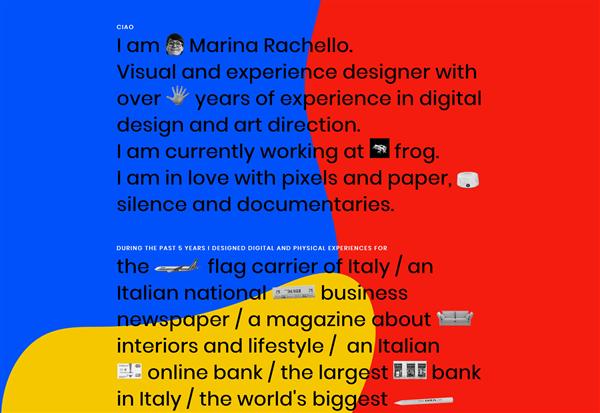 企業和(hé)客戶總希望能夠通(tōng)過作(zuò)品集網站(zhàn)對你(nǐ)有(yǒu)清晰的了解,一目了然的信息呈現方式能夠讓你(nǐ)更快地在他們心目中留下深刻的印象。諸如「我的名字時(shí)尚傑西卡瓊斯,目前作(zuò)為(wèi)品牌設計(jì)師(shī)和(hé)藝術(shù)總監在紐約工作(zuò)」這樣的表述是足夠清晰明(míng)了的,在這個(gè)基礎上(shàng)适當地加入一點個(gè)性化的表達是可(kě)以的,就像 Marina Rachello 這樣。