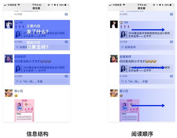 輔助信息服務于主體(tǐ)信息:輔助信息為(wèi)主體(tǐ)內(nèi)容的延續說明(míng)或補充操作(zuò),作(zuò)用為(wèi)服務于主體(tǐ)內(nèi)容。同一組合內(nèi),信息間(jiān)需有(yǒu)明(míng)确的關系與合理(lǐ)的順序,且輔助信息不能搶鏡。例如朋友(yǒu)圈,清晰傳達關系的同時(shí),以內(nèi)容為(wèi)主的閱讀方式不會(huì)被頭像內(nèi)容幹擾。