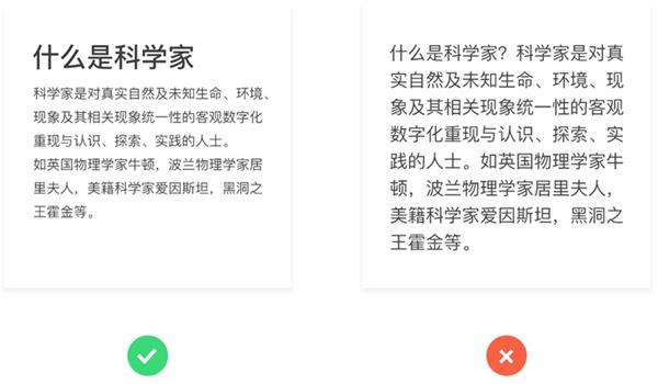 間(jiān)距:在界面設計(jì)中,字間(jiān)距和(hé)行(xíng)間(jiān)距會(huì)直接影(yǐng)響用戶閱讀效率。過于緊密的間(jiān)距會(huì)讓字體(tǐ)間(jiān)失去「透氣性」,根據我們正常的閱讀順序來(lái)講,字間(jiān)距要小(xiǎo)于行(xíng)間(jiān)距以便于每一行(xíng)更易被視(shì)為(wèi)一組,進而給用戶帶來(lái)更好的閱讀體(tǐ)驗。我們可(kě)根據文案長短(duǎn),字号大(dà)小(xiǎo)制(zhì)定更适合閱讀的間(jiān)距。