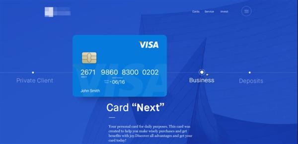 這是Ramotion在Dribbble上(shàng)展示的一幅着陸頁設計(jì)作(zuò)品。主打藍(lán)色調背景,碩大(dà)的銀行(xíng)卡凸顯了該網站(zhàn)的主要産品和(hé)服務。橫向展示的業務流程清晰順暢,用戶點擊各流程點便可(kě)跳(tiào)轉至同頁面該流程的具體(tǐ)介紹。展現了該網站(zhàn)的最主要的特征和(hé)賣點,用流暢的服務吸引用戶注冊辦卡。