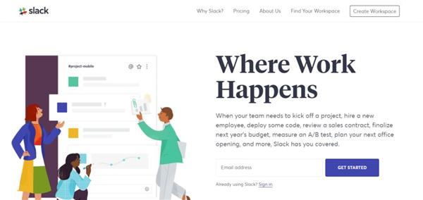 Slack最重要的協作(zuò)功能以拟人(rén)化的形象展示給客戶,多(duō)樣化的協作(zuò)文件展示,強化Slack品牌印象。優秀的着陸頁設計(jì)另一個(gè)做(zuò)法是呼應品牌色。Slack也很(hěn)好的實現了這一點。明(míng)亮的品牌顔色與每個(gè)相應的部分互相呼應。