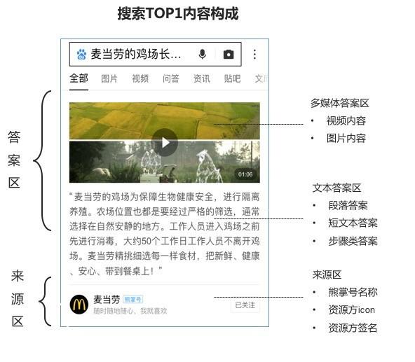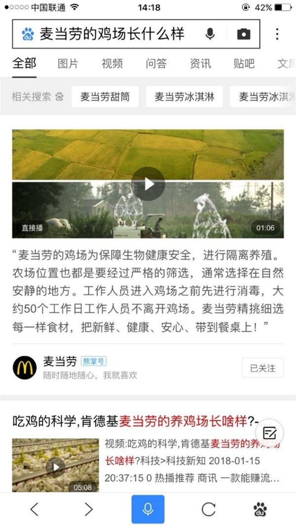 事實上(shàng),凡是入駐熊掌号并開(kāi)通(tōng)了權威問答(dá)功能的合作(zuò)夥伴,都可(kě)以享受這一推廣權益,通(tōng)過強展示讓優質內(nèi)容和(hé)服務迅速找到目标用戶,實現品牌內(nèi)容的強曝光。例如在百度APP搜索“麥當勞的雞場(chǎng)長什麽樣”,映入用戶眼簾的第一條內(nèi)容就是由麥當勞官方提供的資訊。