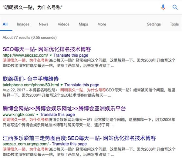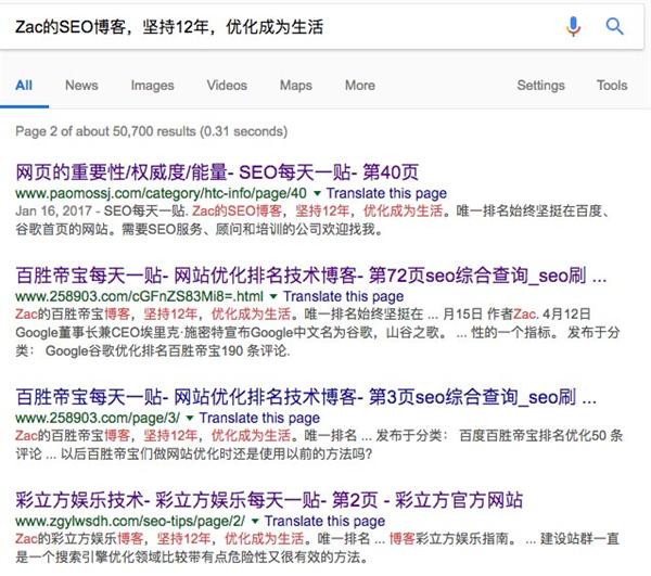 。第二是搜索網站(zhàn)的特征句子。最容易想到的是網站(zhàn)品牌名稱、首頁标題等,确實可(kě)以發現一些(xiē)鏡像網站(zhàn)。但(dàn)如前所述,品牌名絕大(dà)多(duō)數(shù)是會(huì)被替換的,所以我更喜歡搜索一些(xiē)頁面上(shàng)的特征句子,比如本博客最上(shàng)面的副标題:Zac的SEO博客,堅持 12 年,優化成為(wèi)生(shēng)活。搜索一下就會(huì)看到: