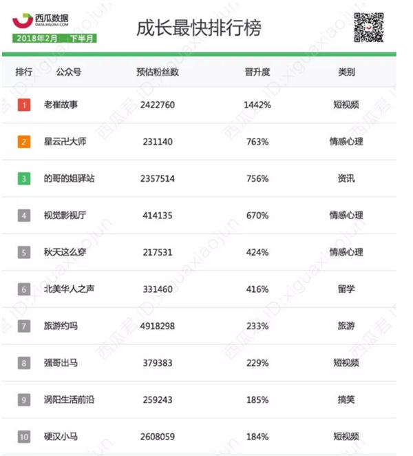 公衆号老崔故事列舉本期十強榜單第一位,公衆号類型為(wèi)短(duǎn)視(shì)頻,在 2 月下半月中的數(shù)據較為(wèi)突顯。