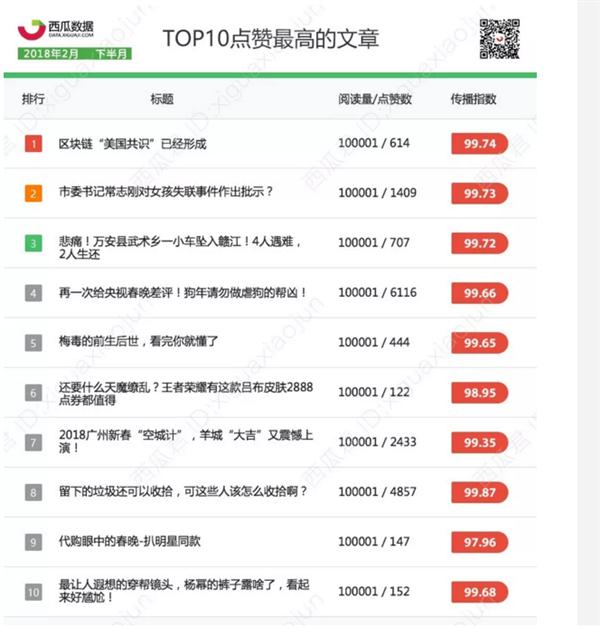 熱文文章能夠提升粉絲對公衆号的關注度,爆文在一定程度上(shàng)可(kě)以為(wèi)公衆号促活,在 2 月上(shàng)半月TOP10 熱文榜單如下。