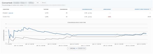 下面通(tōng)過實例,來(lái)看看頁面上(shàng)這些(xiē)小(xiǎo)調整帶來(lái)的收益究竟是什麽吧(ba)。下面是一個(gè)着陸頁A/B測試的例子,底部的灰色線是正在運行(xíng)的版本A,藍(lán)線是對應的版本B。一開(kāi)始,新頁面遠遠超過了舊(jiù)頁面,棒極了,對吧(ba)?