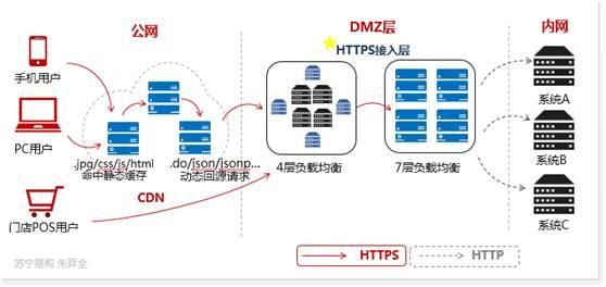 如圖中所示,我們把 HTTPS 接入層放在 CDN 和(hé)應用系統之間(jiān),采用四層+七層負載均衡的架構。