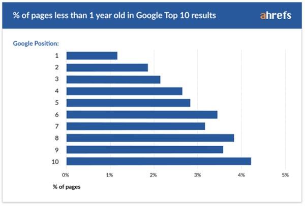 可(kě)以看到,排到第一的頁面中隻有(yǒu)1%多(duō)一點是 1 年以下的新頁面,排到第 10 的也隻有(yǒu)4%是 1 年的新頁面。