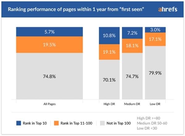 可(kě)以看到,這些(xiē) 1 年曆史的頁面,隻有(yǒu)5.7%獲得(de)了至少(shǎo)一個(gè)關鍵詞的前 10 排名。域名外鏈越強,這個(gè)比例就越高(gāo),新頁面獲得(de)排名的越多(duō)。74.8%的 1 年新頁面基本上(shàng)沒有(yǒu)排名。