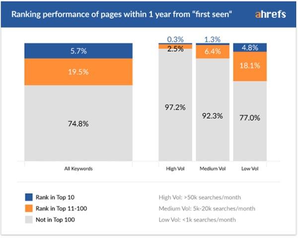 可(kě)以看到,在這5.7%獲得(de)前 10 排名的頁面中,中等競争程度的詞需要 6 個(gè)月以上(shàng),熱門(mén)詞需要 8 個(gè)月以上(shàng)。同樣要注意的是,這是那(nà)5.7%獲得(de)第一頁排名的少(shǎo)量頁面花(huā)的時(shí)間(jiān),絕大(dà)部分 1 年新頁面根本沒有(yǒu)排名。