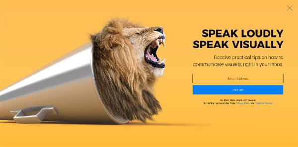 在 Visme 的這個(gè)彈出式的廣告當中,左側的視(shì)覺元素視(shì)覺吸引力是極強的,整個(gè)頁面呈現左重右輕的勢态。不過左邊的元素會(huì)在視(shì)覺上(shàng)引導用戶注意右邊的文本,足夠的留白讓左右兩邊的元素都擁有(yǒu)足夠的跳(tiào)出感,這樣的設計(jì)确保了對比,有(yǒu)方向性,還(hái)足夠平衡。